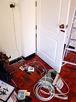 I’m overseeing a 4-man crew of electricians today. They’ve come to add outlets to my bedroom, bathroom, and balcony, as well as enhance security around the house by adding two spotlights to the large side yard and one to the small side (we never know when the geckos might rise against us). Plus, like all the help that comes round the house, they serve the general function of being my in-law’s temporary biotches, which is funny as all hell. Nam’s mom and dad disagree about where to install something or what color it should be, and try to make the workmen take one side or the other… Then I go…
