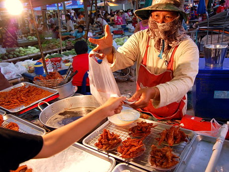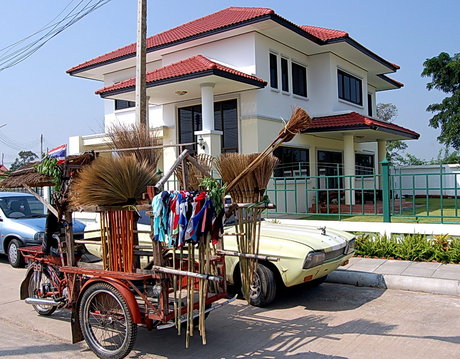We live in a gated community near Mahasarakham University (where Nam is heading up the Japanese Studies department). Every day a few vendors are let in to peddle their wares/offer their services. There’s the ice cream truck, which I have heard (the song is different from anything I have heard in other countries, but just as distinctive) but not seen. There’s apparently a knife man who comes by on a bicycle/whetstone contraption, which I have seen on old TV shows and read about in books, but never seen with my own eyes. And then there’s the Broom Man, who rides around on a reverse-tricycle motorized push cart: The Broom Cart…