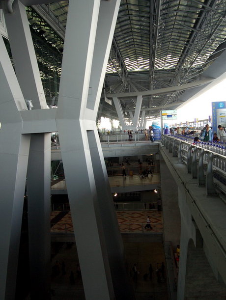 One thought kept running through my mind as I paced the halls of the largest airport I have ever seen: “What a waste!” Can anyone say “Asian Economic Bubble Architecture?” From the slapdash finishing touches to the (very) poorly conceived traffic corridors, Suvarnabhumi Airport is the ultimate expression of arrogance topped with big budget incompetence. Don’t get me wrong – the airport might be seen as beautiful in certain contexts (for instance, to a blind, thirsty traveller having walked in from the wasteland surrounding it*), and it boasts a huge space inside, but unfortunately, it is completely wasted due to the ridiculous floor layout. There are more chokepoints for foot…