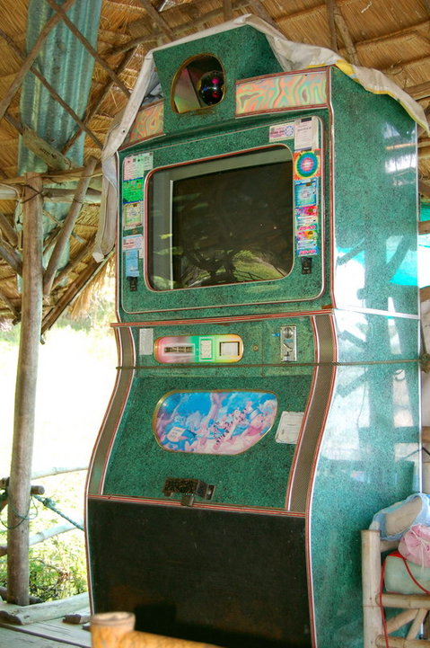 Found on a floating barge restaurant on our way to the candle festival in Ubon Ratchathani a few months ago. Note the lighting ball and licensed song stickers around the screen. Pooh seals the deal, though.