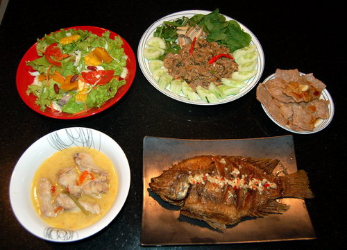 From 12 o’ clock, clockwise: Samoo – A special delicacy of ground pork and a whole bunch of special herbs, from the Ubon area. Nam’s mom made a pot of it for us a few days ago, and she’s the only person we know who can make it. Sukiyaki-sliced beef we found at the local Tesco. I fried it in butter/sesame oil with garlic and sprinkled with coarse ground salt, pepper, and kaffir lime. Deep fried tabtim (hybrid tilapia, pink/orange in color). They fry these (and any other fish) up for you at Tesco. Tom Ka Gai, spicy/sour chicken soup with coconut milk Thai version of a mixed salad with…