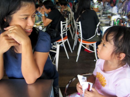 I’m not sure what the context is, but I like their expressions: Taken about a month ago at a restaurant barge in Don Wai Floating Market (which is no longer a floating market, but rather a very hot and crowded indoor market crammed with people), on the banks of the Nakhon Chaisri River, Nakhon Pathom province. UPDATE: Kevin provides dialogue.