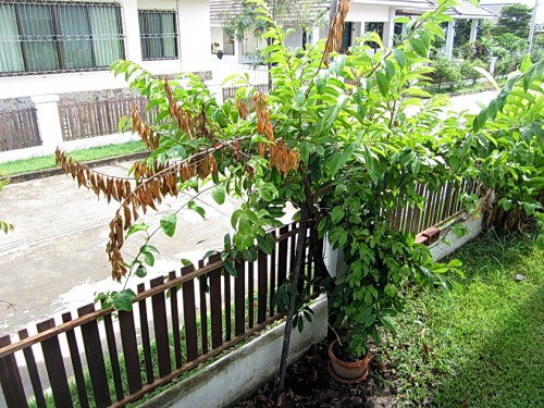Oh, my Gac! Or should I say, fuck cow? The tree I planted a handful of gac vines under, in a pot, allowed just one enough shade to survive a full year. I’ve only spotted one fruit so far, but I’m looking forward to see if it will fully ripen.