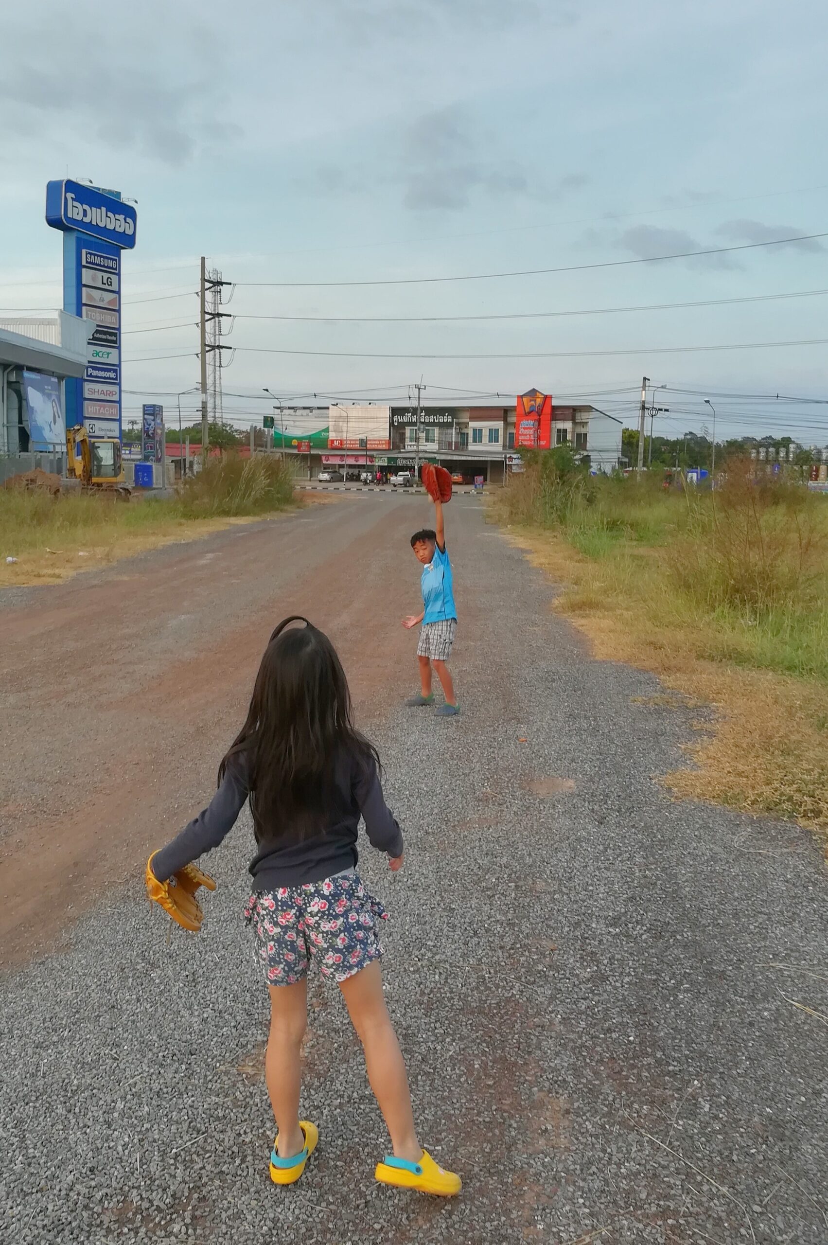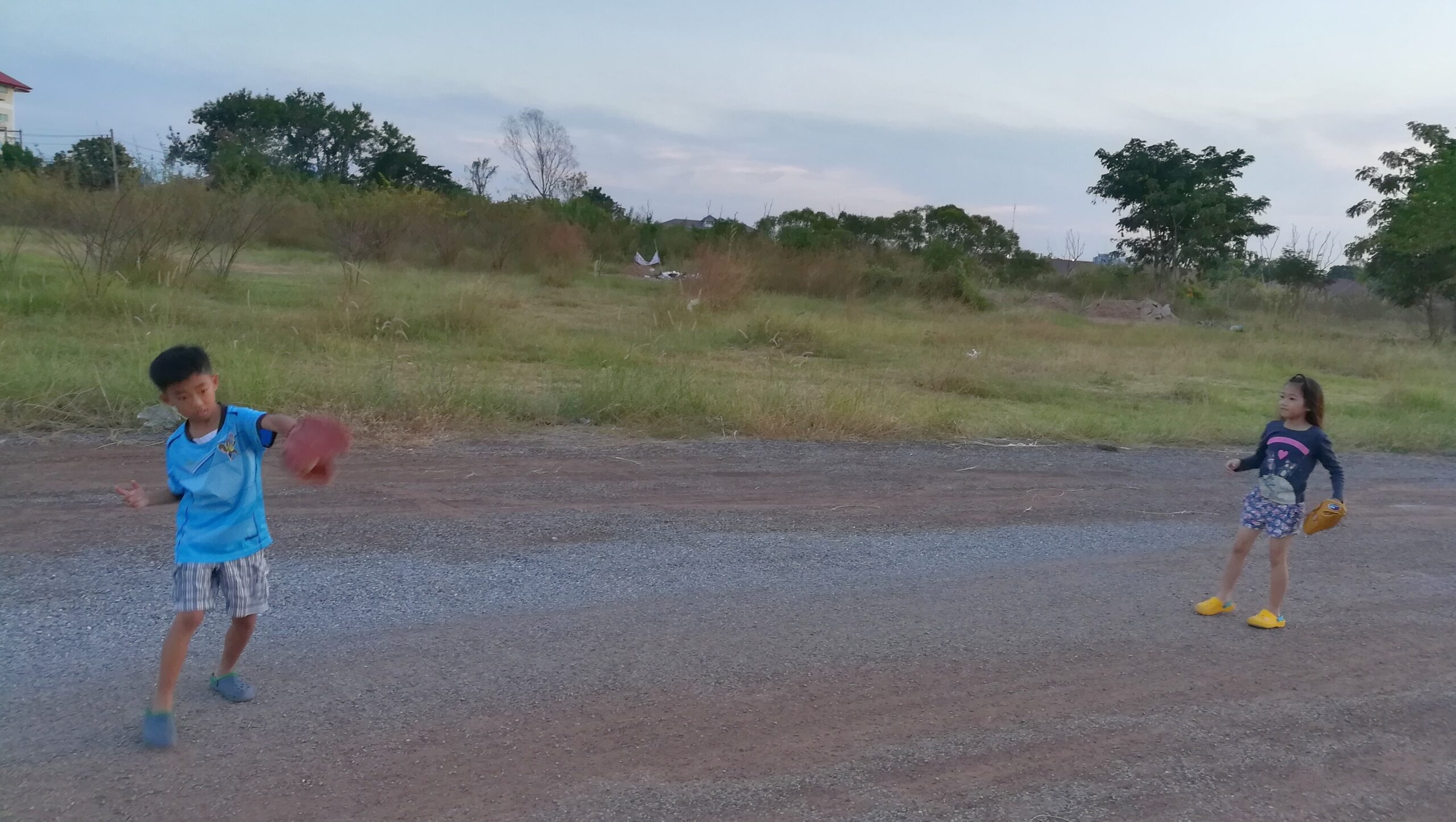 When we play catch or practice hitting balls around the vacant lots and parks around here, people stop to watch. Hmm… I’ve never seen anyone else playing baseball in Thailand, either! I’m not a big baseball fan or anything, but it’s great for kids’ hand-eye coordination.