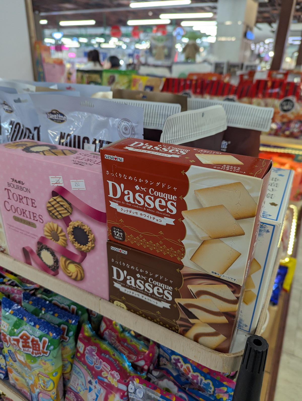 To add a bit more to the cultural mix, this is a Japanese cookie being sold in a Thai department store.