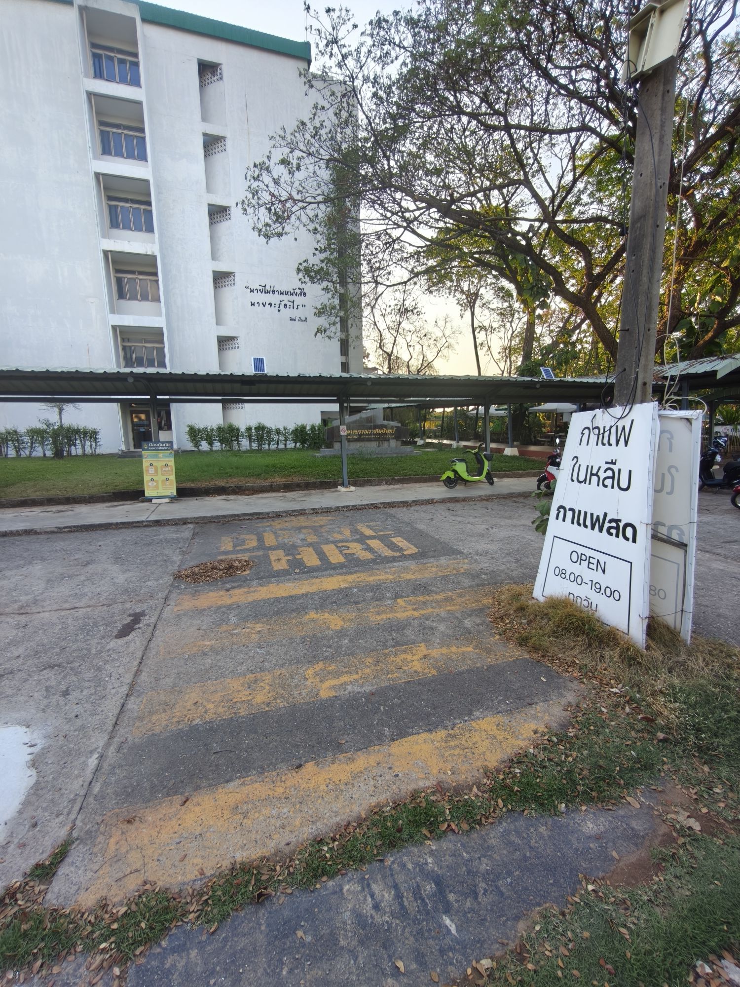 Around Mahasarakham, Photos Drive Thru to Nowhere March 9, 2026 / 0 Comments On campus at Rajabhat Maha Sarakham University, a famous drive thru leads straight into a curb, the lawn, and the library wall.