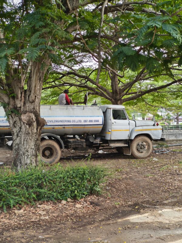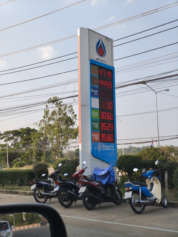 There’s a lot of trucks parked under trees recently up here in Issan. There are numerous gas stations around our house, so we can usually find one with 91 gasohol (10 % ethanol, standard) or e20 (ethanol 20%) and the lines aren’t much worse than normal. There’d even an official app that tells you which stations have what fuel. But diesel is being hoarded up here because of this region’s agriculture, so I’ve been seeing construction equipment and trucks being supplied by containers of diesel carried on motorcycle sidecars quite often, instead of being towed for refueling to a station.