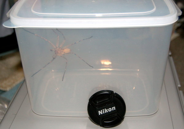 The first time I tried to catch him, he jumped out of the tupperware and onto my hand. Talk about goosebumps… I nearly shit my pants. Nam yelled at me not to kill it – kill it? HOW? Besides, woman, you’re standing on a chair after I flicked it on the floor! After I finally captured the Mighty Awaji Bird Eating Spider, we took a walk down the street and released him in the bushes next to Jusco. If you look closer (open a larger photo by clicking on it), you can see he’s missing a leg. He might be the same one Adam photographed on the front porch last…
