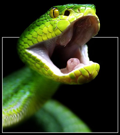 Nam called me up in a panic yesterday because she crossed paths with a snake in the yard of our house (in Thailand). She told me it was about a meter long and light green, and she asked what she should do so I said LEAVE IT ALONE, because all I could think of was: Behold the awesome glory of the White-lipped Pitviper. Of course, it might have been the Toothless Leaf-eating Snake of Northern Thailand, but I wasn’t about to ask her to see if its head was shaped like a diamond or not (and I’m sure Steve Irwin and Jeff Corwin would have agreed with that decision). Meanwhile,…