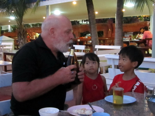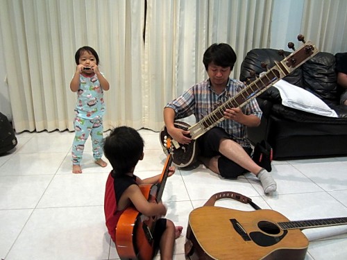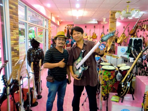 Taro came over a few weeks ago, and we stopped by a recently-opened music shop while the kids were at Tae Kwon Do. It’s the largest music store in Sarakham with possibly legit big brand stock, and also has 5 studio rooms in the back. The owner is super-friendly and let Taro try out the gaudiest German electric I’ve ever seen. (I took this photo with T’s camera)