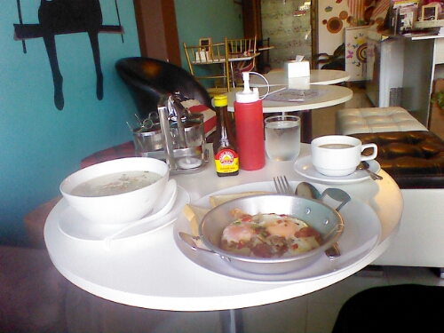 Pan-fried eggs with assorted meat, toast, rice porridge, coffee. It’s hard to find a good breakfast in Thailand if you are tired of the standard fare. We found a good place. — Posted from WordPress for Android —