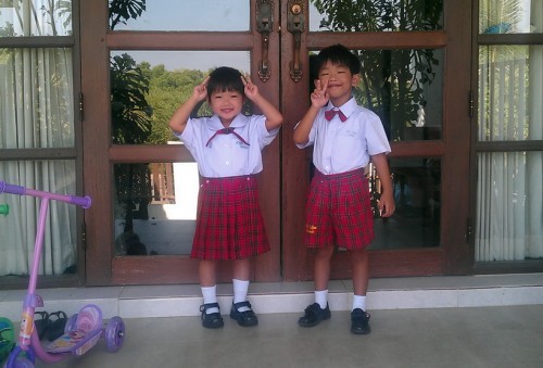 Today marks the first day of the regular term. Max and Mina both went to summer school, but it was more casual and the days were shorter. Today is the real deal. Nam left on a trip to Burma (what an ideal example of poor rebranding – what’s the adjective for “Myanmar,” anyways? What language do they speak there?) yesterday, so the kids are totally on their best behavior because they are with Bad Cop. No crying, no pleading, no nonsense: “Are you guys ready to go to school?” FUCK YEAH, DADDY!