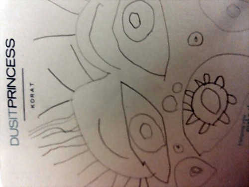 I can’t remember if Max or Mina drew this when we stayed at the Dusit Princess in Korat on the way to Rayong last month. But it looks like a Sponge Bob nightmare, for sure.