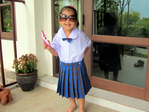 Mina will be going to school with Max after summer break. Mommy took her to buy uniforms (blue is for Fridays, and Thursday they wear uniform running suits), and she immediately wanted to try them on.