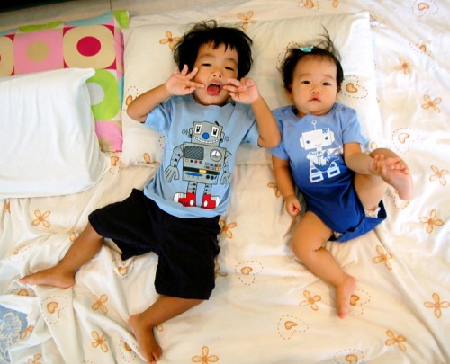 …some days there just ain’t enough time for simple pleasures. And apparently, even that isn’t enough because Nam pulled a large glass marble out of Mina’s mouth about an hour before I found her about to swallow a rubber band. She has very quick hands, and follows her older brother around, whose purpose in life seems to be breaking things into little pieces and strewing them all around. This is a bad combination. Speaking of Max, he got in a squabble with a girl at school today and she apparently stuck a finger in his eye, because his upper eyelid is all swollen up. When I took him to brush…