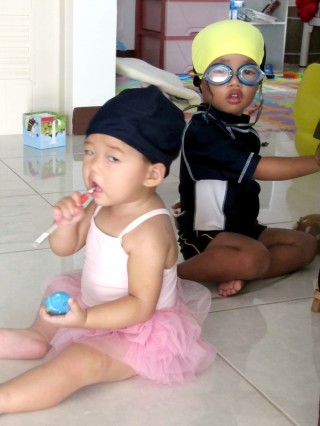 Mina scratched up her nose from falling, so we bought her a hand knit hat* that doubles as a helmet. It’s the only hat she has ever tolerated wearing. Max likes taking photos with mommy. ///// * Max and Mina got matching Lilo & Stitch hats sold by a nice stall vendor. 360 Baht for the pair.