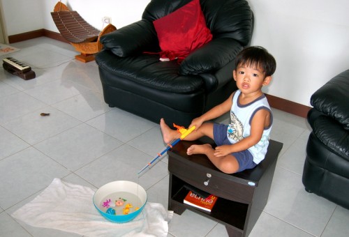 We did this for hours. At least I didn’t have to cut bait all day. ////////////////////// Please note the melodica (a Yamaha Pianica) and ranat (rosewood, I think) in the background. Max’s other instruments are the koto, sitar, djembe, snake drum, theremin, recorder, and flute. He is also getting pretty good on the 16″ stainless frying pan.