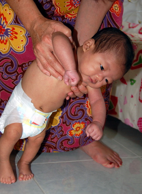 I did, however, find a calibrated vegetable scale at the big marketplace in downtown Mahasarakham for 750 Baht (can weigh up to 15 kgs., green-colored 5 kgs. model was 500 Baht). To this I attached a baby bath chair with a couple plastic ties and some stiff Japanese cord (I know, I know this is just a step above duck taping, but it seems to be working out OK).