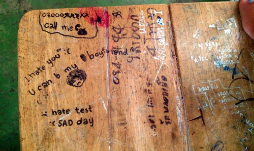 Blackboards, writing on desks, teachers losing their shit and going full psycho on a class full of monkey-goblins – this set of entries is a log of my SCHOOL DAZE. On top of being a full-time lecturer at Rajabhat Maha Sarakham University, I am now a part-time teacher/herder at our attached elementary/high school. For the most part, it is fun. Some days are better than others. Overall, it probably makes me more pleasant to be around since I’m always thinking about what those crazy kids are doing and it makes me smile. //////////////////// Just the other day, though, I held up a flash card with a photo of a monkey…