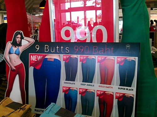 Right on the heels of the Best Product Name of 2013 comes a damn fine contender for Best Marketing Campaign, but I forgot to take note of the brand of jeans using it. I’ll have to check it out next time. UPDATE: The brand is Maximus Roma Jeans, who do’t have much of a web presence but apparently put a value of 110 baht on each of their individual asses.