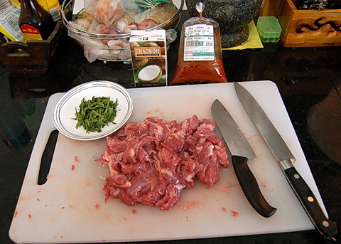Beef Panang is considered a dry curry (for Thailand at least) because it contains less roux (liquid base), and specifically, less coconut milk than other Thai curries. It is also one of the best uses for lean/tough beef, which is great since that’s pretty much all we have around here. Panang is an easy dish to make and my way is even easier than most. I’ve tried it the normally advocated way, by heating curry paste in coconut milk first, but I’ve found this is a waste of time when using ready-made curry paste. So without further ado: INGREDIENTS Beef – Any cut. Any quantity approximating that in the photos…