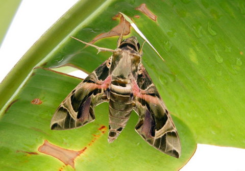 I have no idea what the real name of this moth is, and have no time to pore over moth photos for an ID, either. I found it stuck to one of the banana trees we planted behind our house when I was watering this evening. It was about three inches from wingtip to wingtip. //////////// Related link: A lucky photo of the elusive Japanese Hummingbird Moth