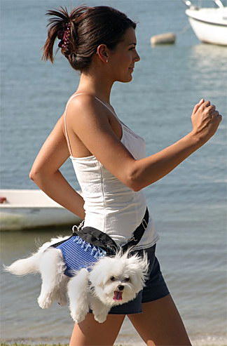 Oh, my shaka. “PuppyPurse makes it easier to take your dog with you, whether you’re shopping, fly fishing or just taking a walk and nothing gets in the way of snuggling and kissing your baby whenever you want to” The only question is, can you get one that holds seven puppies? (also see here and here) According to the official website, this product seems to appeal mostly to snobby rich blondes. And how do the dogs feel about it? Just shoot me, already.
