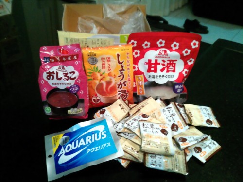 I hereby deem this the Ultimate Japanese New Years Variety Pack! From top left, clockwise: oshiruko (sweet red bean soup), shoga-yu (hot ginger drink), amazake (sweet sake w/curds), matsutake soup packets (awesome with instant noodles), and Aquarius drink powder (for the following day’s hangover). Thanks, Taro! I am looking into getting my hands on equipment to pound our own mochi with from next year.