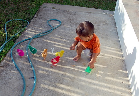 Luring them in. Brush! Brush! Brush! They got away! A few weeks ago, Max’s grandmother brought over these little guys from the night market in a neighboring town, Nong Vang. I wasn’t really keen on the idea of keeping them at first because I was afraid Max might kill them… He’s still too young to understand his strength or about hurting things. Sure enough, the couple weeks was filled with episodes of Max almost strangling the yellow one, Max stomping on the yellow one and hurting its leg, and as shown above, Max coercing them into various forms of Godzilla role play. As it turned out, however, the chickies were…