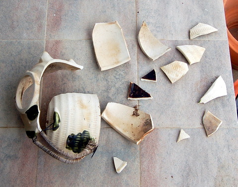 Almost a month ago, a big storm came and blew my ceramic boo-chan (pig-shaped mosquito coil holder) over. As you can see, he did a Humpy-dumpty which made me really sad because I bought him for half off at Jusco in Sumoto a few years back and will probably never buy a 7,000 yen ceramic pig ever again. Luckily, it was nothing two and a half tubes of super glue (the most popular brand in Thailand is called Power Glue) couldn’t fix: Actually, if you look closely, you can see that mommy pig’s been put together again, too.