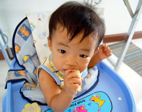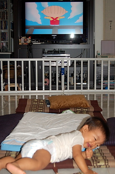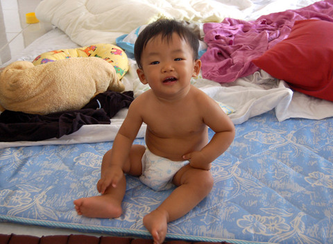 Max is developing at such a fast pace, it’s hard to keep track of. I’m just jotting a few notes down here. He knows the word “clock” in Thai. If you say it, he looks up at the clock. Not only does he like playing with all the remotes in the house, he has started to understand that they control something. He was playing with the TV remote this evening and looking up at the TV every time he pressed a button to see what had changed (nothing, since he was pointing it at himself, but still…) He can almost stand up without hanging onto anything. He can trick us…