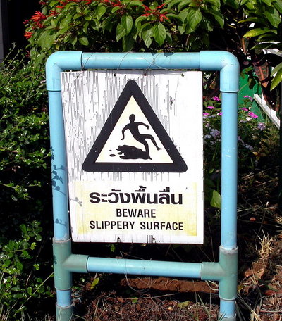 Here’s a couple of interesting signs I found on the trip: This is actually the best “slippery when wet” warning illustration I have ever seen. Seen outside a public restroom at a highway rest stop on the way to Mahasarakham. Likewise, this is the best “Caution: Falling Durian” illustration I’ve ever seen. I came upon this sign in the middle of the jungle at the backside of a roadside fruit stand/cafe. Awesome.
