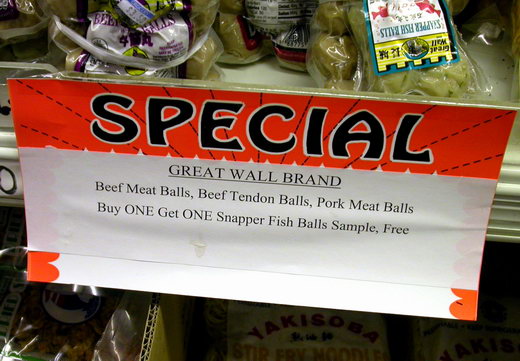 One of the rites of passage in an Asian American household is fighting with your sibling for the eyeballs of the fish served up for dinner (assuming one large whole fish shared by the whole table, as opposed to smaller fish that provide eyeballs for each person). What I definitely do not remember is fighting over fish balls. Must be a SE Asian thing. Photo taken in the Thai Town area of LA.