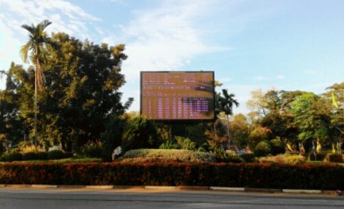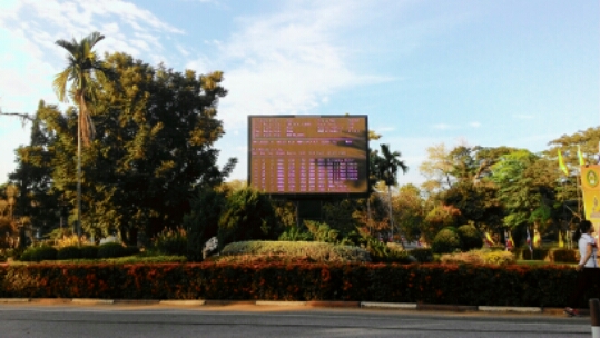 This is a huge Windows-driven LCD with which I gauge my arrival to the university every morning. It’s usually not on when I roll by the first time since I have a lot of early morning classes, but on free days I sometimes see diagnostic screens, Windows startup, and the plethora of error dialogs that the operator has to click through before getting to the day’s scheduled programming. Sometimes I dream of hijacking it for giggles. Posted from WordPress for Android