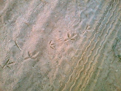 Max was following these footprints the other day, and correctly identified them as a dinosaur, Honda Wave, giraffe, and cheap-ass flip flop size 9, respectively.
