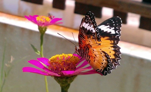 …but only two little birds were right outside our doorstep. On a tall plant next to the stairs leading up to our front porch: