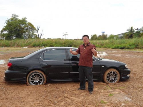Yes, I got stuck. I arrived a bit late to the first wedding of two only to get trapped in the parking lot due to idiots who had parked every which way Undeterred, I squeezed through a couple of pickups to a promising dirt field that appeared to be damp, but solid. A couple feet into it, the car bogged down a bit, but not wanting to get stuck, I pushed forward… and got stuck further into the field. Anyway, lemons into lemonade I say. This is what my car would look like slammed, with brown tires: Eventually, a truck came and pulled our trusty Cefiro out of…
