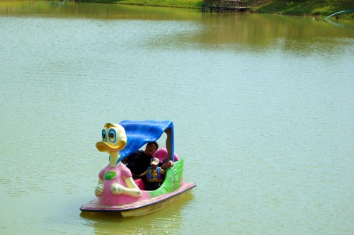 This photo is from a couple months ago, but Max insisted we do the same thing today in the afternoon heat… Can you tell how off-balance the keel is? (and yes, the water really is that green) Note: This is a big man made pond in front of a newly-built conference hall at the new campus of Maha Sarakham University, where Nam teaches.