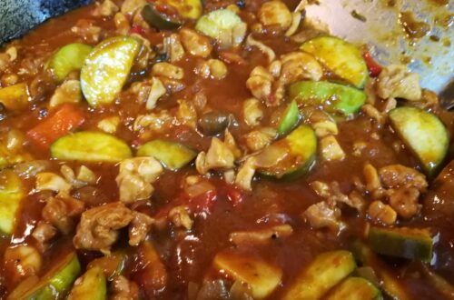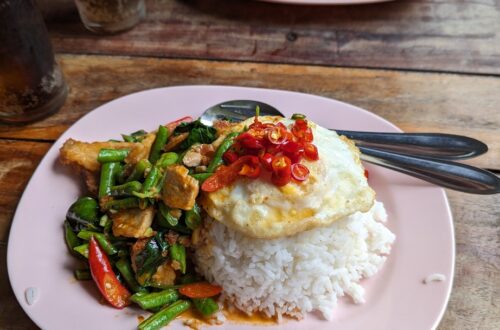 This is a bael or bael fruit AKA Bengal quince, wood apple, stone apple or seer phael (head-fruit). In Thai it’s known as matum. In Thailand, bael is usually found in the form of dried slices, which are reconstituted in water to make juice. Our housekeeper brought over a few from her tree and I was surprised at how hard and heavy they were. We did as she said and boiled them, but then accidentally left them out on a hot night and the next day, they had fermented in the shell and burst, oozing a heavy syrup onto our counters. I threw them into the pond out front as…